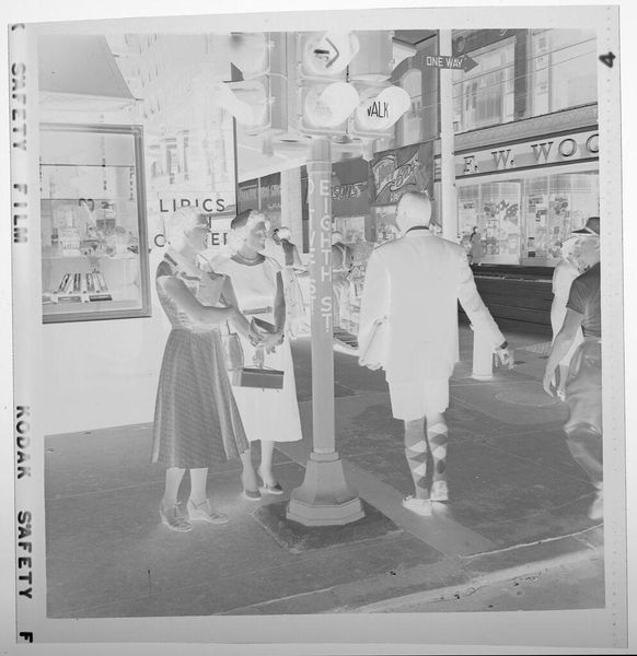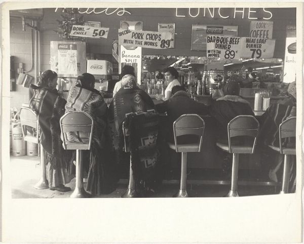 Curator: This gelatin silver print by Peter James Studio captures performers on stage before a seated audience. It’s simply titled “Untitled.” Editor: It has a certain theatrical energy, doesn't it? The high contrast and the framing give it a sense of drama, a visual hierarchy, and interesting textures. Curator: The performers’ costumes definitely draw the eye, especially those patterned fabrics, which speak to particular cultural traditions. There is an element of masquerade here, of archetype, and of cultural expression. Editor: True, but consider also the gaze of the audience and the directionality of the players. The composition guides our eyes through the scene, following the lines of sight. Curator: It’s fascinating how stage performances become a mirror for the audience’s desires and anxieties, reflecting back their own cultural norms. Editor: Indeed. The play of light and shadow contributes to a sense of unfolding narrative. Curator: Ultimately, this image invites us to consider performance as a kind of ritual, a way of embodying and transforming shared cultural meanings. Editor: Yes, and as a purely visual experience, the photograph offers a compelling study in form, light, and the dynamics of space.