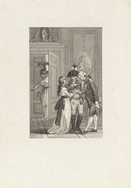 Curator: Here we have "Man with a Letter and a Kneeling Woman Before the Window," an engraving created by Reinier Vinkeles sometime between 1751 and 1816. Editor: Immediately, there’s a dramatic tension that's created through the composition itself. The rigid linearity of the room—the window panes, the wainscoting—contrasts so sharply with the woman's imploring pose. Curator: Indeed. Vinkeles employs the established conventions of Baroque drama, focusing on emotional extremes. We have this theatrical staging, and note that while called Baroque, it also speaks to Neoclassical taste in its linear clarity. How interesting that an engraving would be in line art. Editor: The stark black and white amplifies that emotional weight, doesn't it? The scene feels stripped down, essential. All lines matter. Semiotically, even the differing dress of the two figures tells us something; he is dressed as someone coming from somewhere, but her clothing is soft, almost clinging, speaking of a contained domesticity that opposes freedom. Curator: And within the social context of the time, we could posit all kinds of scenarios contributing to her supplication. Is she pleading for understanding? Begging forgiveness? Or is she confronting a sentence carried within that letter he holds? It becomes almost secondary, then, to what this engraving *represents.* A microcosm of domestic and romantic struggle as an entertainment for public view, mediated via prints. Editor: I see your point. However, I want to reemphasize how this is so precisely staged; there is almost a stage-like arrangement here. The almost mathematical exactness gives order to strong emotions on view. In essence, structure heightens content by contrast. Curator: What makes this so evocative is precisely how it takes familiar, accessible themes, that many could afford and, in turn, opens them to interpretations beyond the anecdotal. It is more than its narrative qualities, that speak, and much louder, on a universal condition that exists even now in changed forms. Editor: Absolutely, the composition is more than just a snapshot; the overall design elements shape our reading and imbue it with timeless weight. A most captivating use of light and line, however, for what now would be described as a minor work of art.