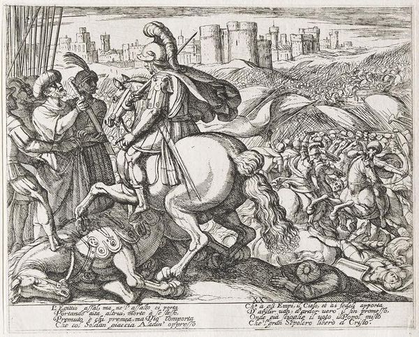 Curator: This print, titled "Paulus wordt door de joden aangevallen," made by Johann Sadeler I in 1581, is teeming with chaotic energy. It is done in ink using engraving techniques, in a distinct Mannerist style. What strikes you most about it? Editor: It’s the sense of overwhelming violence. The figures are all contorted and intertwined. I am intrigued and puzzled by the setting; it looks to be Jerusalem and Rome combined! What historical and social tensions do you think this image is channeling? Curator: That is an insightful reading, situating this artwork into the intersection of identity and politics. Remember that prints like this were not just art, they were propaganda, widely disseminated during the religious conflicts of the late 16th century. This image depicts St. Paul, a Jew turned Christian, being attacked. It's useful to consider that this scene resonated with contemporary anxieties about religious conversion and social order. Consider the Mannerist style: Does the exaggeration amplify a particular viewpoint or agenda, especially related to existing conflicts in Europe? Editor: Definitely. The dramatic poses and exaggerated musculature feel designed to elicit a strong emotional response. Also, I had not considered that the architecture represents both Jerusalem and Rome! By merging Jerusalem with Rome, is Sadeler suggesting something about the universality of this conflict, or perhaps Rome as the new Jerusalem? Curator: Precisely! These choices were far from accidental. The composition encourages us to think critically about how images participate in shaping beliefs. Now, reflecting on our conversation, how has your understanding of the print changed? Editor: I see it now as much more than just a historical depiction. It's a loaded statement about religious identity, social upheaval, and the power of visual rhetoric in a time of intense religious conflict. Thank you.