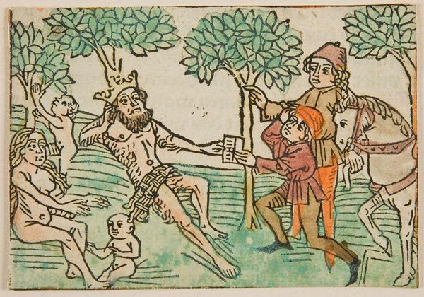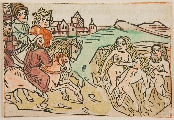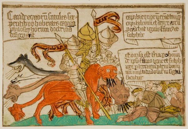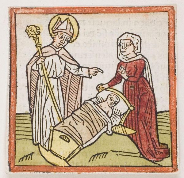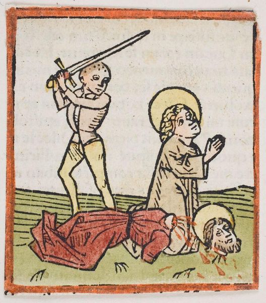 Curator: This is "Beheading of Saint John the Baptist," an anonymous work held here at the Harvard Art Museums. Editor: It's striking how flat and graphic it is, like a scene from a medieval comic strip. Almost naive, but with real violence. Curator: Indeed. The beheading is a common subject in Christian art, often symbolizing martyrdom and unwavering faith. Notice how the halo still hovers around the severed head. Editor: That halo feels important. It's like even in death, his holiness persists. And the executioner looks almost bored, doesn't he? Curator: Precisely! Such a depiction might suggest a commentary on the banality of evil, the casual indifference to profound acts. Editor: It’s stark but gets the message across. A brutal scene, yes, but the graphic style almost… distances us from the horror. Makes you think. Curator: Yes, it is powerful how such simple symbols can carry so much meaning. Editor: A story told with such economy, yet it echoes through centuries. Fascinating.