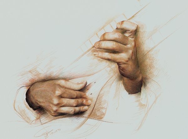 Alexander Roitburd made this painting, "The Parting of Hector and Andromache #5", using oil paint. It's like he's digging into something primal here. The earthy palette, a mix of fleshy tones against that stark black, feels raw, visceral. Looking at the surface, the paint has a really tactile quality. It’s almost sculptural in places, creating this push-and-pull between the figures and the void. There is some intense mark-making at play: the artist uses broad strokes and impasto techniques that build a sense of urgency and emotion. Those little touches of pink, like delicate wounds, amplify the fragility of the scene. This piece reminds me of the emotional intensity you see in some of Francis Bacon's work, but Roitburd brings his own distinct sensibility to the canvas. Like all great art, it leaves you with more questions than answers, doesn't it?