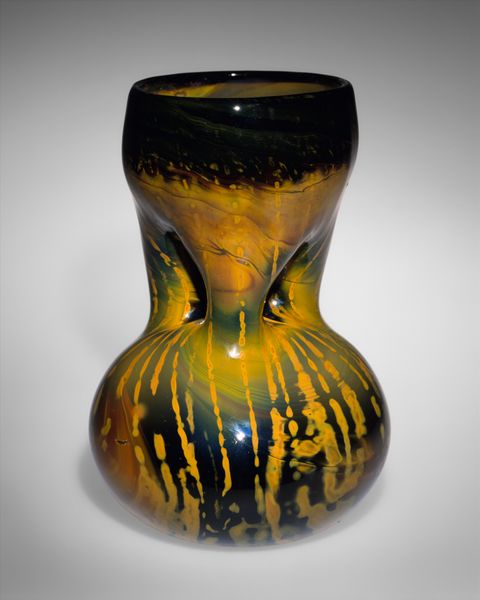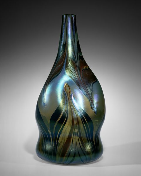 Editor: This exquisite vase, dating from 1893 to 1896, was crafted by Louis C. Tiffany and is currently held at The Met. I'm immediately drawn to the iridescence and the almost liquid quality of the glass. What catches your eye about it? Curator: Formally, the success of this work lies in its manipulation of line and color. Notice how the vertical striations, transitioning from vibrant blues and purples at the base to more muted, gold tones at the upper register, create a sense of upward movement. Editor: Yes, it's almost flame-like in that transition. Curator: Precisely. The controlled application of these colors is remarkable. Also observe how the curved lip counters the verticality. These juxtapositions are not merely decorative. Editor: So you’re saying it’s more than just a pretty object? Curator: Certainly. Consider how the form of the vase itself-- the curvature and how it reflects the light -- generates internal movement. Note also the interior is of different coloration. What effect does this create? Editor: The dark interior almost gives depth to the vertical design? Curator: An intriguing assessment. Tiffany successfully orchestrated an exploration of surface and form within the medium of glass, achieving more than a purely decorative function. Editor: I see. By analyzing its structure and composition, it’s less about what it depicts, and more about how it uses form and color. Thank you, it does add more understanding. Curator: A close inspection and application of art theory will help unlock a multitude of treasures in art analysis.