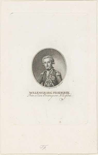 Curator: Here we have a print dating from the 19th century titled "Portret van Willem I Frederik, koning der Nederlanden." It appears to be an engraving. Editor: The stark monochrome creates an interesting effect, it feels very...regal. It reminds me a bit of official stamps, actually. Curator: That's a fair point. Note the composition within the oval. The artist has tightly framed Willem, placing emphasis on the regalia – those elaborate epaulettes, the crisp lines of his uniform. It reinforces your observation about officialdom, suggesting power, stability, and perhaps even a touch of the austere. Editor: The central placement of the star is key. Given Willem I’s position and the era, the imagery strikes me as consciously modeled on the sun-king Louis XIV. The artist wants to position him as this infallible godlike ruler. The slightly averted gaze contributes to that feel. Curator: Indeed. We can observe neoclassicist principles at work in the careful rendering of form and the calculated clarity of the lines, everything has been calibrated to project authority. Observe, too, how the shading builds depth. Editor: Symbols really are deployed here in service to a concept. Everything says ‘I am King!’ Even his stoic expression plays a part, adding an element of impassivity as if he were destined. Curator: What strikes me most is the meticulous detail despite it being a print; observe the skill needed to modulate light and shadow through such a medium. It invites prolonged contemplation and rewards close inspection of technique. Editor: I leave contemplating on how visual languages get translated, iterated, and reiterated across history – these patterns and how they give us such deep cultural connections to historical characters! Curator: Precisely! And for me, seeing the mastery in the application of engraving breathes fresh life into such familiar stylistic forms.