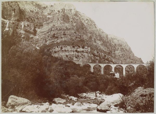 This photograph, titled 'Waldkater in het Bodedal' and taken by E. Rose, uses the craft of photography to frame a landscape. Though we don't know the exact date, the sepia tone and mounting suggest it was created in the late 19th or early 20th century, when photography was becoming more accessible but still required a skilled hand. Consider the labor involved: the careful composition, the development process in the darkroom, the printing and mounting. Each step demanded precision. Photography in this era was not just about pointing and shooting. It was a chemical and optical process, a craft that translated light and shadow into a tangible image. The photograph itself, a fragile paper object, is now a relic. It invites us to consider photography not just as a means of documentation, but as a material practice embedded in a specific time and place. It challenges our contemporary understanding of photography as instantaneous and ubiquitous.