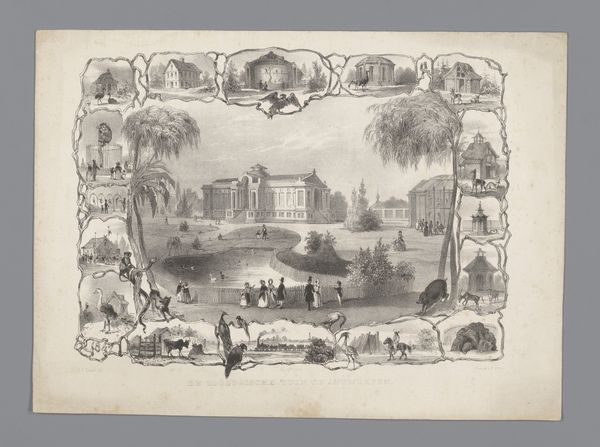 Editor: This is "Gezicht op Arnhem," or "View of Arnhem," an engraving dating from 1812 to 1887 by Frederik Lodewijk Huygens. The sepia tones and meticulous detail give it a serene, almost nostalgic feel. What compositional elements stand out to you? Curator: The composition utilizes a clear foreground, middle ground, and background, creating spatial depth. Consider the frame itself – its ornate embellishments isolate the idyllic landscape from the surrounding negative space, drawing attention to the details within the picture plane. Observe the distribution of light and shadow. Where do you notice the strongest contrasts, and what effect does this create? Editor: I see a sharp contrast defining the architecture in the middle ground, emphasizing the volume and placement of structures relative to one another and the sky. It's like the buildings are rising, competing to pierce the canvas. Curator: Precisely. The strategic placement of dark and light tones not only defines form, but it contributes to a rhythmic quality across the image. How might we interpret this play of light and shadow within a formalist reading? What inherent aesthetic experience does it offer, independent of historical or cultural contexts? Editor: Well, removing context, it appears like a balancing act, giving an experience of weightlessness even though there's much architectural detail. It has this self-referential quality, focused only on what’s on the print. Curator: Precisely. It invites us to appreciate the aesthetic relationships for their own sake. Through a focus on its formal properties, one sees the artistry emerge as an orchestration of lines, tones, and shapes within the carefully bounded field. Editor: It’s interesting how focusing on the form isolates and elevates the visual experience! Curator: Indeed, this is one method of looking to unveil inherent qualities that provoke thoughts within a closed loop of artwork qualities.