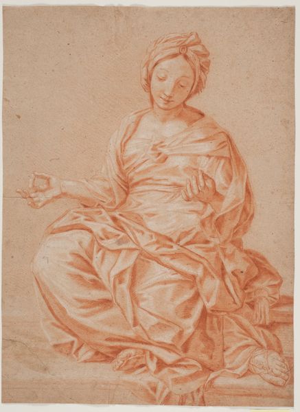 Editor: Here we have Giovanni Giacomo Barbella's "Study for a Royal Bride, Reaching Out Her Left Hand (Catherine of Siena?), made between 1615 and 1656, executed in pencil. It's interesting to observe the process captured within what appears to be a sketch; the way he renders form with light pencil work makes it almost seem ephemeral. How do you read this piece? Curator: I read it as a fascinating artifact of artistic labor. The red chalk and toned paper – common materials – speak volumes. Barbella wasn’t aiming for illusionism here, but to work through problems of form and gesture. He’s laying bare the production, the how of creating an image. It prompts us to question the very idea of “high art” when we see the raw process. Do you consider this work challenging social barriers by experimenting with accessible medium? Editor: I hadn't considered the implications of the medium itself, I was focusing more on the narrative. I can see your point now. It appears quite unfinished. The status of 'drawing' then indicates it might have been for a specific purpose, something not destined for the salon, something quite functional in the broader studio context, right? Curator: Precisely! And that's the materialist perspective. We consider what these drawings *did* within the art world, not just what they *represent*. Was it a demonstration piece? Practice? A study of particular features for future larger work? A contribution of knowledge to other workshop colleagues? All of these social factors were at play in its production and are deeply intertwined with its materiality. What did Barbella intend for this piece, and who was his intended audience? Editor: It really transforms the drawing once you look at it from that production standpoint, considering materials, process, and use instead of purely symbolic value. Curator: It’s about decentering the idea of individual genius. Seeing how artistic creation is embedded in social practices, material conditions, and often hidden labor!