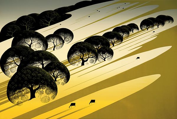 Eyvind Earle made "Snow Tree," using smooth paint to give us a world that feels crisp and still. The art of making art is like finding the right note, then another, and then building to a melody. The texture here isn’t about gobs of paint; it’s about making flat surfaces feel deep. Look at how the light hits the snow – it’s not just white, but layers of shades, giving it volume. The color palette is a study in contrasts, and that dark purple background makes the snowy parts pop. The way the branches reach out, delicate but sure, reminds me of Cy Twombly’s line work – each mark a dance. Earle's world is different, yet like so many landscape artists, he reminds us that nature is the ultimate innovator. You come away from this piece with a little snap of joy.