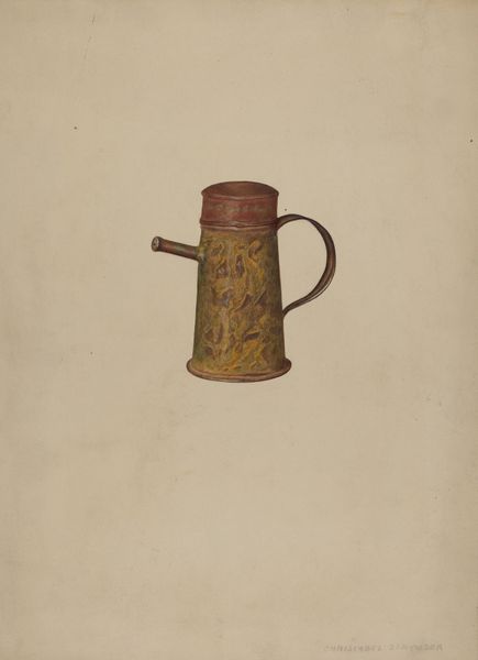 Editor: This is Hans Mangelsdorf's "Lamp," created around 1938 using watercolor and charcoal. There's something about the simplicity of the form and the muted tones that I find really appealing. What visual elements stand out to you in this work? Curator: Note the careful construction of forms. Observe the cylinder which serves as the central volume. Then the interplay between horizontal and vertical elements, aren’t you struck by how meticulously each section fits together in terms of shape? Consider how the artist explores depth and dimension through shading, creating a semiotic dialogue through visual representation. Editor: Yes, the shading definitely gives it a 3-D effect. Is there any significance to how Mangelsdorf chose to depict this everyday object? Curator: Consider this question instead: what impact does the use of watercolor, with its translucent qualities, have on your perception of the object’s texture and form? Does it, in your eyes, soften the edges and make it approachable despite its mechanical nature? The inherent semiotics present us with further insights into how this work evokes a relationship between objectivity and the viewer's interpretative consciousness. Editor: That’s a great point! It does soften it somehow. I was so focused on it just being a lamp. Curator: Exactly. By choosing watercolor and charcoal, he transforms a functional object into a study of form and light. Through line, shadow, tone, color, contrast, and texture, he encourages us to focus on form. The choice and execution is intentional; he guides us away from a reading steeped in any historical context toward that objective. What have you learned about how technique choices influences our understanding of an artwork’s function, in reality versus perception? Editor: Seeing it as a formal composition rather than just an illustration has totally changed my perspective. I see what you mean about form!