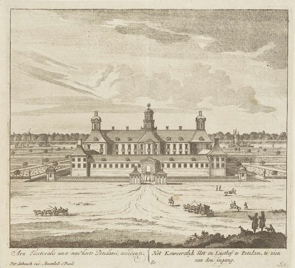 Curator: Here we have Isaac de Moucheron's "Het Loo," a pen and ink sketch, believed to have been created between 1677 and 1744. It's currently held here at the Rijksmuseum. What strikes you most when you look at this piece? Editor: The precision, actually. There's an almost dreamlike quality in its meticulous detail; everything is so rigidly geometric. I wonder what it felt like to wander those gardens, so controlled, so intentionally shaped. Curator: It’s quite likely De Moucheron intended for it to feel that way. Notice how the lines create this strong sense of perspective, drawing our eyes towards the palace itself. There's a formality there, right? We’re seeing more than just a landscape; it’s a statement of power. Editor: Precisely. The sketch almost flattens the garden, emphasizing its constructed nature. It lacks a certain… organic vitality. Even the sky seems subdued, reinforcing this feeling of imposed order, you know? Curator: Perhaps, but for me, there’s something beautifully human in all this calculated planning. These gardens were made to be enjoyed. And the medium! A personal sketchbook would lend a spontaneity rarely captured within meticulously orchestrated design. Editor: That's an interesting idea, because on one hand I see a story, but it almost feels cold. It’s technically proficient, undeniably. But maybe that’s part of its intent; maybe the feeling of order is meant to inspire...something like awe. Curator: Possibly. De Moucheron allows us a glimpse into the aristocratic lifestyle, but I also imagine he himself enjoyed getting lost within that vast and orderly garden space, allowing imagination and freedom to emerge. Editor: It invites contemplation, doesn't it? This carefully constructed world rendered in precise lines… almost like a memory being meticulously catalogued. Curator: Absolutely. Ultimately, "Het Loo" invites us to consider our relationship with the natural world. Editor: Yes, a potent demonstration of intent, isn’t it? Thank you, that was really enlightening.