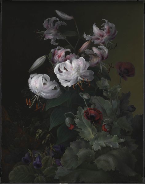 Editor: Here we have Jacob Vosmaer's "A Vase with Flowers" from 1613, currently at the Metropolitan Museum of Art. It's an oil painting, and I am struck by how much depth the dark background adds to the whole composition. It feels almost staged. What historical context should we keep in mind while viewing it? Curator: Indeed, this still life exists within a rich social and political landscape. Paintings like these, especially during the Dutch Golden Age, transcended simple depictions of beauty. Consider the patronage system; these works weren’t made in a vacuum. Who commissioned them, and what did these flowers symbolize to the aspiring middle class? Editor: So, you're saying it’s about more than just liking flowers? Curator: Precisely! It speaks to burgeoning wealth and a desire for status through consumer goods. Notice anything unusual? Editor: I see a tulip that's almost… striped? Curator: A sharp eye! These were 'broken' tulips, highly prized and wildly expensive at the time during the tulip mania. By placing it so prominently, what could Vosmaer be commenting on? Was it celebrating newfound financial freedoms, perhaps also commenting on the absurdity of speculating flower markets? Editor: It feels like there's both admiration and maybe a bit of a wink involved, a commentary on fleeting beauty and, maybe, financial instability. It makes me consider what symbols will communicate those issues in *our* time. Curator: Absolutely. Appreciating the socio-economic context really transforms our perception of this otherwise simple bouquet. It compels us to think about art’s broader cultural influence, doesn't it?