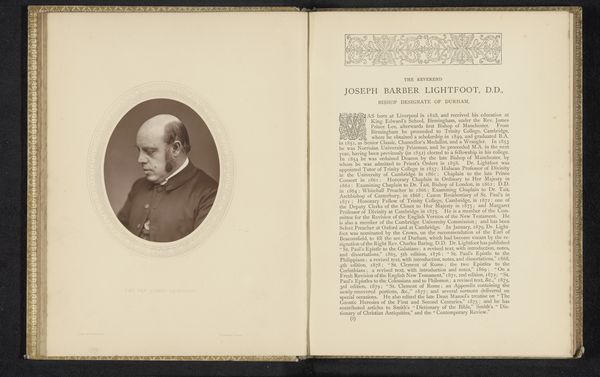 Curator: My first impression? Grave and stately. Editor: Right, this portrait, "George Edmund Street," created sometime before 1878, has a wonderfully sepia tonality characteristic of a gelatin silver print. Lock & Whitfield, the studio, captured Street in profile. The very shape and presentation, almost book-like, lends it an air of memorial. Curator: Indeed. The oval vignette and overall sepia immediately reference photographic conventions prevalent in Victorian portraiture intended to emphasize status and solemnity. Do you sense a Victorian preoccupation with respectability? Editor: Absolutely! But what about the gaze directed away? A dreamy detachment... It reminds me a bit of those Romantic poets staring into the distance, searching for some sublime truth or something equally dramatic. Perhaps it speaks to an inner artistic vision, not always visible to the public eye? Curator: Quite possibly. Looking at his neatly trimmed beard, tailored suit and serious demeanor, though, the image aligns so clearly with idealized portrayals meant to convey wisdom, artistic genius, and unwavering principles, ideals cherished and amplified within artistic circles. This particular mode would likely establish authority and lasting impact. Editor: I suppose... But isn’t there also a performative element to all this seriousness? Almost a uniform of the age for artistic giants. The backdrop even feels contrived... like someone is deliberately staging history, which ironically can feel both distant and yet oddly... human. Curator: Agreed, these crafted personas certainly create layers that future viewers should examine carefully. But now I recognize why that face felt familiar: Street designed law courts, cathedrals and churches… that faraway look he seems to have has the quality of a grand architectural plan in mind. Editor: Well, I certainly feel more grounded by the end of that conversation, less drifting than our man George, staring out to the future! Curator: Exactly! May his buildings remind us how carefully cultivated self-presentations endure.