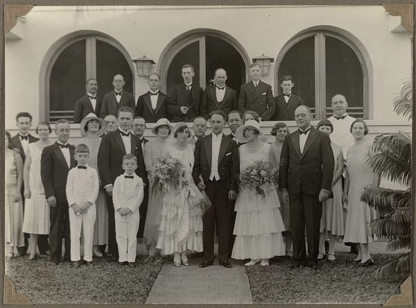 Editor: Here we have an untitled wedding portrait by Martin Schweig, currently residing at the Harvard Art Museums. The formality of this photo really strikes me. What can you tell me about the social context surrounding images like this? Curator: It's a fascinating glimpse into the performance of social status in the early 20th century. Wedding portraits like these were carefully orchestrated displays of affluence and social connections. Notice the composition, the subjects, and the setting; the family portrait hanging on the wall behind the wedding party is suggestive of the desire to claim an elevated social position and historical pedigree for the bride and groom. Editor: I see. So it's about more than just capturing a memory? Curator: Exactly. It's about constructing and projecting a particular social image. The photographer, Schweig, also plays a role in solidifying these social rituals. Do you see that his studio location is listed in the lower right corner, "ST. LOUIS"? This suggests that the photo studio also caters to clients who are looking to show off their recent wedding. Editor: That's a great point. I hadn't considered the studio's role in all of this. It definitely gives me a new perspective on how images function within society.