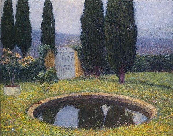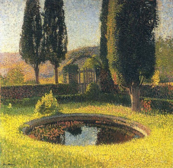 Editor: So this is Henri Martin's "Bassin Et Tonnelle Sud-Ouest Du Parc De Marquayrol," created around 1920 using oil paint, and the technique seems to be Divisionism, or Pointilism. It feels very dreamlike, with all the tiny dabs of color. What do you see when you look at this landscape? Curator: I see a powerful assertion of bourgeois leisure, but also a possible critique, intended or not. Consider the date: roughly 1920, just after the horrors of WWI. This image, depicting a tranquil garden scene, offered an escape for a society grappling with profound loss and disillusionment, don’t you think? Editor: That makes sense. It definitely seems like a comforting scene. What elements support this social reading? Curator: Note the manicured garden, the deliberate geometry offset by the natural forms. These are clear symbols of control and order – values highly prized by the ruling class after the chaotic war years. Is this escapism or subtle propaganda, though? Who did Martin intend to reach with this vision? Editor: Ah, the intended audience! So, was he reinforcing traditional values or simply trying to offer a beautiful and soothing image to the masses? Curator: Perhaps both. His divisionist technique, with its separation of colors, itself speaks to fragmentation and a yearning for harmony. It mirrors the societal fractures of the time but also suggests a path towards reunification – a visual metaphor for post-war healing, accessible mainly to the well-to-do. Editor: That's fascinating! I hadn’t considered the connection between the technique and the socio-political context. Curator: Art doesn't exist in a vacuum. The context of the painting deeply impacts its interpretation. Editor: Exactly, I now understand the deeper resonance between art and its moment. Thanks!