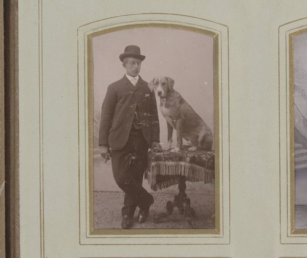 Editor: So this is Keith Arnatt's photograph, "Walking the Dog." It's a black and white photo, and there's something very still about it. A man and his dog, posing formally against this old ruin. What's your take on it? Curator: Well, it tickles me, this image. It's almost aggressively ordinary, isn't it? The man with his loyal mutt. But Arnatt was a conceptual prankster. Is it about mortality? Is the ruin a stand-in for the body, the dog representing…faithfulness? Maybe he’s just showing us the quiet dignity in everyday life. What do you think? Editor: I hadn't considered the deeper symbolism. It's more complex than I first thought. Curator: That’s the magic, isn’t it? A pinch of humor, a dash of melancholy, and a whole lot of questions.
