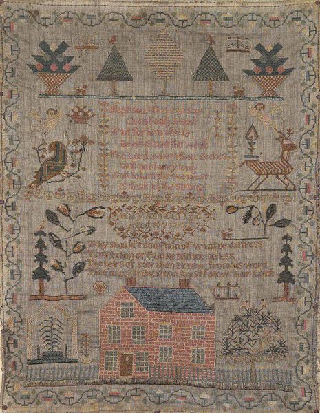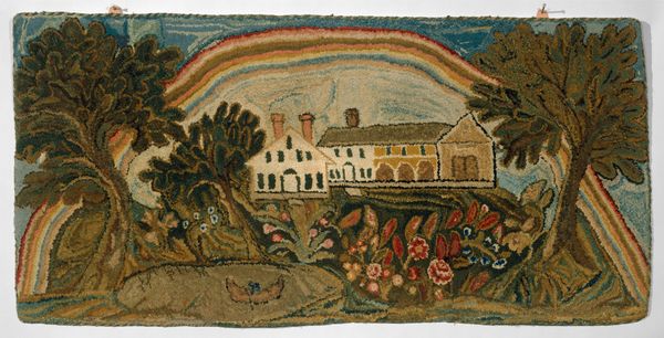 Editor: This textile work, "Hooked Rug" by Lucy Trask Barnard, made around 1860, offers a domestic scene of a quaint house framed by trees and a floral border. There is a certain nostalgia to it that feels distinctly American. What stands out to you about its visual language? Curator: The home is framed in the center like an Eden, evoking cultural memory. Notice how the flowers create a protective enclosure, echoing folk traditions where botanical symbols guard domestic tranquility and familial continuity. Editor: A protective enclosure, that's an interesting way to put it! I wouldn't have considered the arrangement that way. The colors are also quite muted. Curator: The subdued palette speaks to something as well. Earth tones evoke an archetypal connection with the land. There's something comforting and reliable here. Imagine this rug in a 19th-century home. The visual symbols offered warmth and respite, fostering an almost ritualistic space for connection and conversation, imbuing daily life with cultural meaning. How do the naive aspects speak to you? Editor: Well, the composition is simplified, isn't it? Which I suppose enhances that familiar mood. And this emphasis on comfort over realism is compelling. I see how folk art uses recurring motifs to evoke deeply shared understandings of the home. Curator: Precisely. The simplicity, combined with this careful, symmetrical composition, shows how much emotion and information is conveyed through common symbols. How has looking more deeply at the artwork altered your impression? Editor: It's amazing to think of all the layers of meaning imbued in such a simple, everyday object. I now appreciate its role as a carrier of cultural and personal history. Curator: Yes, from the ground up.