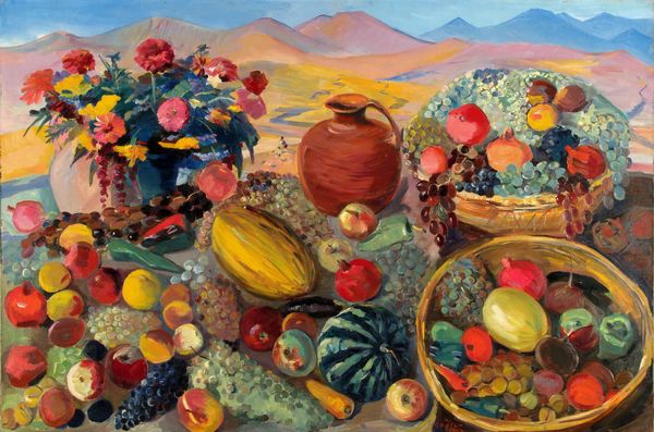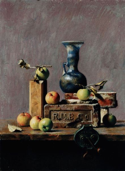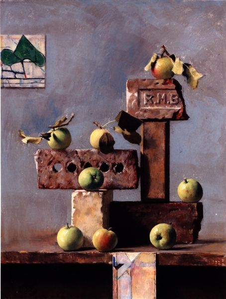 Editor: So, here we have *Gourds, Bricks, and Block with Hand*, an oil painting by Daniel Greene. The title itself makes me think of construction, like setting up a building site. Yet it feels so staged and unnatural… almost like the fruits and vegetables have been dethroned. How do you interpret this work? Curator: Well, immediately, I’m drawn to the use of ordinary objects – gourds, bricks – elevated through the act of painting. The placement of such raw, rough and even imperfect elements into this still life feels deliberately arranged to be observed, doesn't it? These gourds have been harvested and positioned within a tradition, while also becoming democratised subjects themselves. Editor: So the historical setting really adds another layer? Curator: Precisely. Think about the art world as a hierarchical space, defining which artists are worthy of attention and support. Greene presents us with these mundane objects and seems to ask the audience a crucial question: who or what shapes this sense of artistic and historical worth? Editor: Interesting! The piece really highlights that objects themselves become vessels of worth only when displayed in a particular setting... kind of like in a museum like this one. Curator: Exactly! By placing the pumpkins into this almost contrived landscape, Greene hints at a critique of artistic merit, bringing to mind themes of social equity. It is an almost subversive action using realistic and familiar visual language, and subverting tradition from within, wouldn't you say? Editor: I see what you mean, these aren't the usual pristine subjects you see in fine art, and stacking up mundane objects is a clear way to create artistic and social statements. Thanks, I hadn't looked at it that way before. Curator: My pleasure. Art invites all kinds of perspectives and dialogues, but these dialogues can also alter the power that the image might seem to hold, at first glance.
