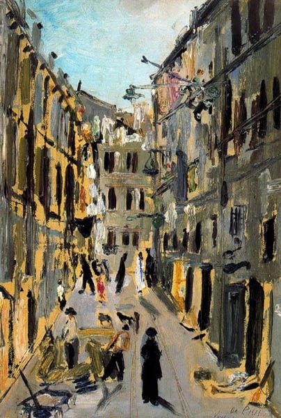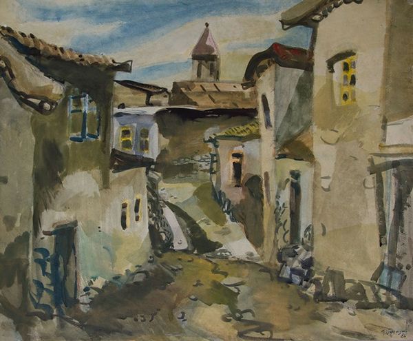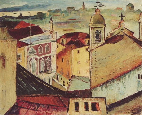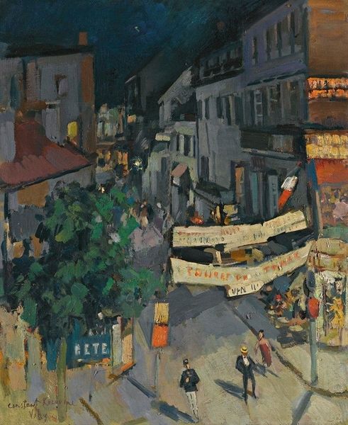 Curator: Looking at Konchalovsky’s 1913 work, “Design for the opera by Wolfgang Amadeus Mozart, 'Don Giovanni'”, I’m struck immediately by how he conjures up, for me, a feeling rather than a literal place. Editor: Indeed, that’s an excellent way to put it. The materiality, the rough handling of oil paint, leads us to the urban environment through its layered application rather than any kind of trompe l'oeil illusionism. We see the labor right there on the canvas, the thick brushstrokes creating buildings. Curator: Yes, the very materiality breathes life into the scene. The opera is, of course, itself a heightened reality, a stylized drama. And Konchalovsky somehow echoes that in his method. There's a lovely dreaminess here, even in the sharp angles of the buildings, isn't there? Like remembering a bustling piazza in the warmth of the sun. Editor: You know, it is interesting that you point that out, I notice that he gives equal attention to the staging of urbanity versus its potential disintegration. Konchalovsky, as stage designer, had to create compelling environments with limited means, this piece appears to focus on the visible traces of such constructions by celebrating the materials at hand. It has a wonderful rawness about it. Curator: I wonder if his own artistic background - he initially wanted to be a musician - seeped into this visual design for the stage? His use of color, in particular, feels symphonic, building to crescendos in those vivid rooftops and that dark sky pressing down. And those almost cartoonish figures in the foreground, are they singers waiting in the wings, or memories taking form? Editor: Well, speaking of the “figures” as material instantiations, these visual gestures have to contend with specific socio-historical realities within Russia that directly affected not only opera culture but theatrical practice at large in 1913. In my mind, Konchalovsky's rendering is an argument for elevating set design. Curator: Fascinating point. And it seems entirely apt. I’ll never look at Don Giovanni quite the same way. Editor: Precisely. Now we know that operatic design contains its own artistic merits worthy of display.