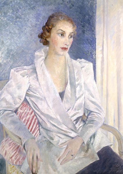 Curator: Haddon Hubbard Sundblom is credited with this lovely piece, "Portrait of a Lady," crafted with oil paints. What's grabbing you about it? Editor: The color, immediately! This pale, almost silvery blue dominating everything…it feels both regal and strangely melancholic. There’s a quiet drama about it. Curator: It is indeed quiet, reflective, like a page out of someone's diary. You know, Sundblom might be most famous for his… decidedly less subtle Santa Claus ads. A whole different realm. Editor: Good heavens! Really? How fascinating. Knowing that, the "academic art" style becomes even more interesting. This feels like such a deliberate shift. A play on persona perhaps. A symbol. Like an actor deliberately playing against type, making you see them differently. Curator: Absolutely! It’s not what you’d expect. The flowers feel symbolic, too—that almost overpowering bouquet beside her. What does it evoke for you? Editor: They’re magnolias, aren’t they? Opulence, purity, but also death… It’s quite the contrast with the sitter’s restrained gaze, her almost self-contained posture. The ring on her finger also suggests marriage or a binding contract with a symbolic undertone that goes back in centuries. It is like love can bind but also restrain. Curator: Her eyes are direct, but she's not *quite* engaging. I wonder what story Sundblom was trying to tell here. Maybe it’s a portrait about unspoken tensions, the weight of expectation. It definitely lingers in the mind, this image. Editor: Yes. She looks like a memory, a half-recalled dream. Perhaps it’s about how we perform identity for others versus who we really are beneath the surface. The muted palette makes it even more elusive and the curtain behind the women reminds us that we never truly know each other or our history in a concrete, unfiltered form. Curator: A good reminder as we contemplate not only what we are viewing, but why. Thank you for making me reconsider a piece I thought I knew well. Editor: The pleasure was entirely mine! It’s paintings like these that remind me that, often, what isn't shown speaks louder than what is.