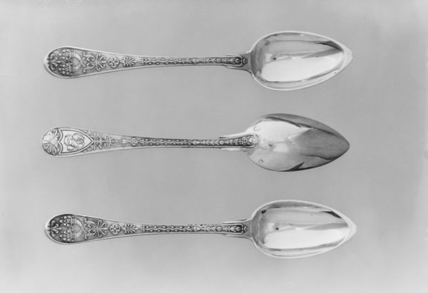 Here are two teaspoons crafted by Rufus Farnam, likely in the early 19th century. Their reflective surfaces and elongated forms immediately draw the eye. The spoons present a study in simple elegance. The curved bowl transitions smoothly into a slender handle, creating a visual flow. The composition emphasizes linearity and balance, reflecting a neo-classical aesthetic. The reflective surface of the silver enhances the subtle contours, playing with light and shadow. These utensils transcend their everyday function through their formal qualities. Farnam's work engages with ideas of domesticity and refinement. Silverware in this period signaled social status and adherence to codes of polite society. The spoons, therefore, are not merely tools but symbols of cultural values and social distinctions. Ultimately, the lasting appeal of these teaspoons resides in their refined form, which speaks to broader cultural narratives of taste, class, and the rituals of daily life.