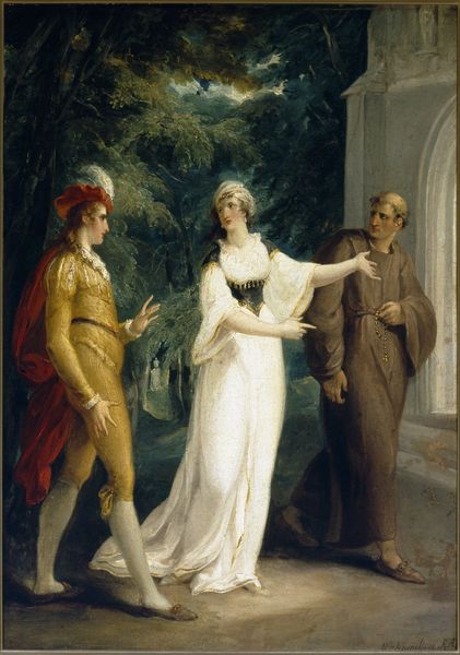 Curator: This is George Dawe's "Naomi and her Daughters," now at Tate Britain, painted sometime before the artist's death in 1829. I'm struck by the heavy drapery and somber tonality. Editor: The fabric really *is* the subject here, isn't it? Look at the way the light catches on those folds, especially in Naomi's ochre robes. It almost obscures the figures within. Curator: But that concealing effect is central to understanding the painting. It mirrors the emotional weight of the Biblical story, the deep sorrow of loss, and the women's symbolic roles. Editor: Perhaps. Or, it's a study in available pigments. Those earth tones would have been cheaper and easier to source than brighter hues, influencing the painting's overall palette and mood. Curator: Regardless, the image endures, still resonating across centuries. Editor: Yes, even with its constraints.