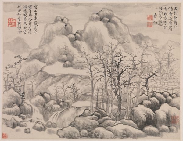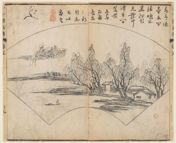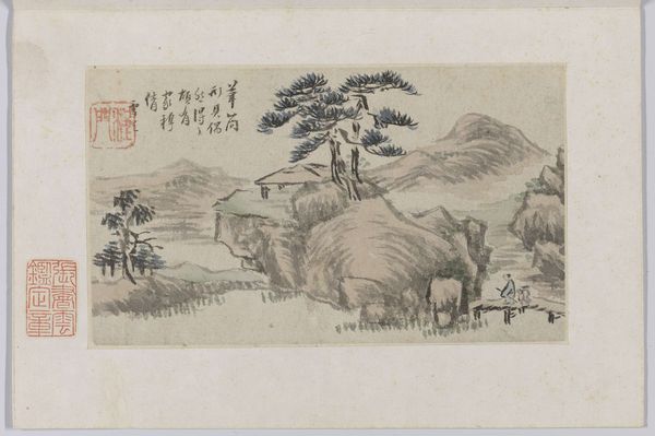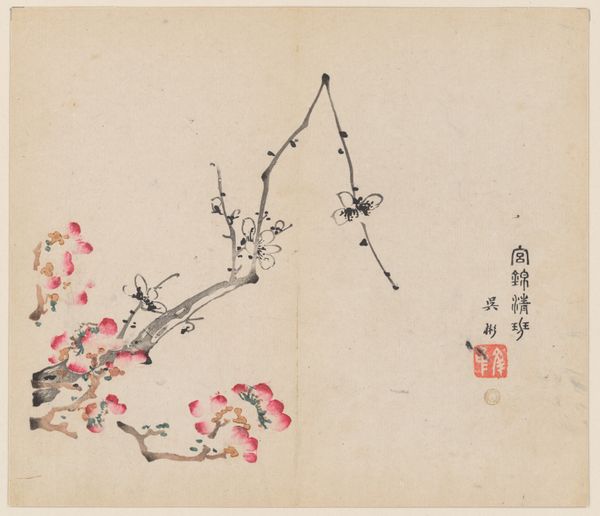 Curator: Here we have a page from the "Ten Bamboo Studio Manual of Painting and Calligraphy," created around 1633 by Hu Zhengyan. It’s a woodblock print using ink and colors. Editor: My initial impression is one of serene quietude. There's such deliberate use of negative space, a real sense of sparse, melancholic beauty... Like a breath held just before winter truly sets in. Curator: Yes, that melancholic beauty is quintessential in depictions of nature in Chinese art. The stark lines emphasize certain aspects to heighten symbolic importance. Notice, for example, how the old plum tree seems to represent perseverance, renewal and longevity amid harsh conditions. Editor: That's it! You’ve put a finger on what makes it so moving. I see it as a picture about aging, isn't it? Like watching an old friend, their strength diminished, but no less beautiful. I imagine Hu Zhengyan wasn’t just showing us a plum tree, but an emblem of resilience against time, with the trunk bending like an arthritic hand! Curator: Quite insightful. The placement of each element, every stroke is intentional, guiding the viewer towards that exact interpretation. And look at the colors - delicate shades selected for their symbolic value and refined visual effect, not aiming at true life resemblance but expressing deeper meanings. Editor: Those little pops of red, they remind me of little embers stubbornly glowing when the light around grows dimmer! Almost cheeky against the pale winter tones... Is that a characteristic of his style or a wider practice in the Ming Dynasty? Curator: Very perceptive, a trademark of that period; notice it's not merely decorative, the choice evokes associations to vital energy and warmth! It signifies more than what meets the eye – this harmony reflects universal order in miniature. Editor: It really is layered! I came expecting just a simple landscape, but it whispers of much more... mortality, resilience... the cyclical nature of things. Art history is wild; this page is an entire universe! Curator: Indeed, artworks like these, rooted in centuries of cultural values and techniques, often reveal as much about ourselves as they do about their subject. They can change how we perceive symbols. Editor: And they encourage us to see that aging isn't about withering, but perhaps just another, more sophisticated bloom. Cheers to that!