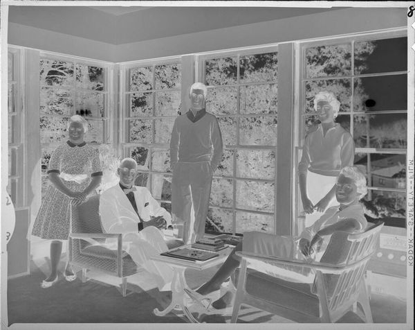 Editor: This photograph by Jack Gould shows a family in their living room. It's an intimate scene, but the negative format gives it an eerie feel. What symbolic weight do you think these domestic images carry? Curator: The photograph inverts our expectations, doesn’t it? Family portraits often stand as testaments to stability. But the reversal here hints at the fragility beneath the surface. Notice the lamp: a common symbol of enlightenment, but here its glow is inverted. What does that suggest to you about the family dynamic? Editor: Perhaps a disruption of traditional roles, or a hidden truth? It feels like a commentary on the idealized image of family life. Curator: Precisely! The inverted light touches everything, questioning what we’ve come to expect from the nuclear family as an emblem. Editor: It’s amazing how reversing the image changes the entire narrative. Curator: Indeed, the photographic negative, like a suppressed memory, reveals the undercurrents of daily life, turning a simple scene into a complex symbol.