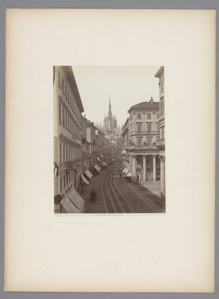 Editor: We're looking at "Gezicht op de Corso Vittorio Emanuele te Milaan, Italië," a photograph taken by Giacomo Brogi sometime between 1864 and 1881. It captures a bustling street scene in Milan, and the towering Duomo in the background makes quite an impression! What stands out to you? Curator: The grandeur of the architecture definitely speaks to the era's aspiration for progress and national identity, especially given Italy's unification movements during this period. Think about how urban planning here projects a sense of unified Italian identity. I wonder though: whose progress are we really seeing? Look closer: who populates this space? Editor: Mostly men, it seems, from what I can see. Curator: Exactly. Consider how photographic images like this—seemingly objective—actually reinforce specific social hierarchies and power dynamics. The Corso Vittorio Emanuele wasn't just a street, it was a statement. Its design intentionally curated a specific type of civic life, and it subtly excluded certain communities. This space for burgeoning capitalism excluded some while privileging others. Editor: That's interesting. So, the photo isn’t just showing us a street, but also who that street was designed for. Curator: Precisely. By examining the built environment and the people represented—or conspicuously absent—we can unpack broader questions of gender, class, and access in a rapidly changing society. We can question whose story gets told. Editor: That gives me a completely different perspective. I guess photographs, like paintings, can also carry ideological weight. Thanks! Curator: Indeed. Analyzing these images can open up discussions about whose voices and experiences are historically privileged. Food for thought.