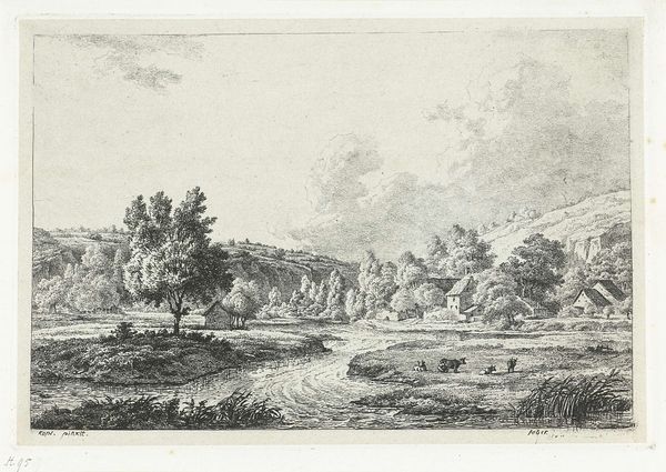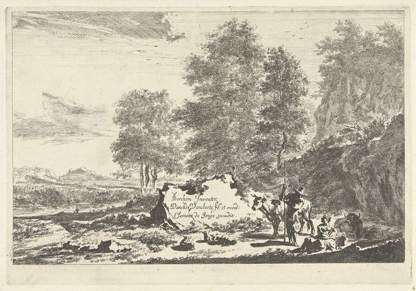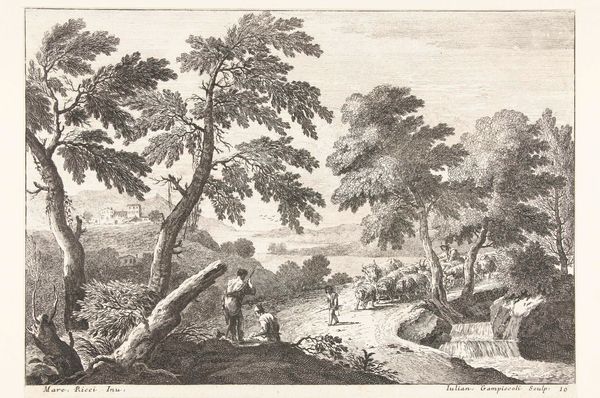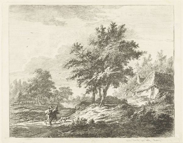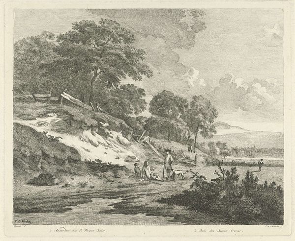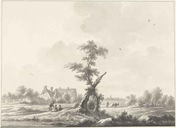 Editor: So, this is *Landschap buiten Haarlem*, or Landscape Outside Haarlem, an engraving by F.W. Musculus made sometime between 1747 and 1758. The details achieved through engraving are incredible! I notice how carefully the artist depicted a rural scene with figures going about their daily lives and rabbits, evoking a really calm feeling. What can you tell us about the setting and people presented in this artwork? Curator: It’s fascinating how a seemingly straightforward landscape reveals so much about its socio-cultural context. Look closely – how is labor depicted? Do we see idealized peasants or a more realistic depiction of the rural working class? The positioning of Haarlem in the background is significant too. It presents the city as this entity looming over a tranquil foreground of agrarian daily lives. Do you think this engraving presents a picturesque escape from urban life or makes a subtle commentary on their interdependence? Editor: I suppose it could be both, an escape and a reminder! The city being in the distance suggests escapism, but the figures remind us about labor necessary to uphold that city. I also notice that the human figures are smaller than animals, and the trees look bigger than any of them! I would not have imagined it being such a deep perspective. It also shows an unequal relationship between mankind and the nature they inhabit. Curator: Exactly. Engravings like this were also instrumental in shaping ideas of national identity and collective memory, shaping how the public understood and related to the countryside. Think about it – this isn't just a scene, it’s a carefully constructed *image* of Haarlem and its surrounding lands designed for consumption and interpretation. Do you see how this print contributed to a broader visual culture? Editor: Definitely. Thinking about it, I can see that a work like this shows not only nature and daily life, but also makes us aware of society and our role as citizens of the state and appreciators of nature and art. Curator: Precisely! And by recognizing those complexities, we can appreciate this tranquil landscape as something more profound. Editor: I've never looked at baroque landscape in this manner. Thank you for shining a new light on what these works can mean in relation to us and society!