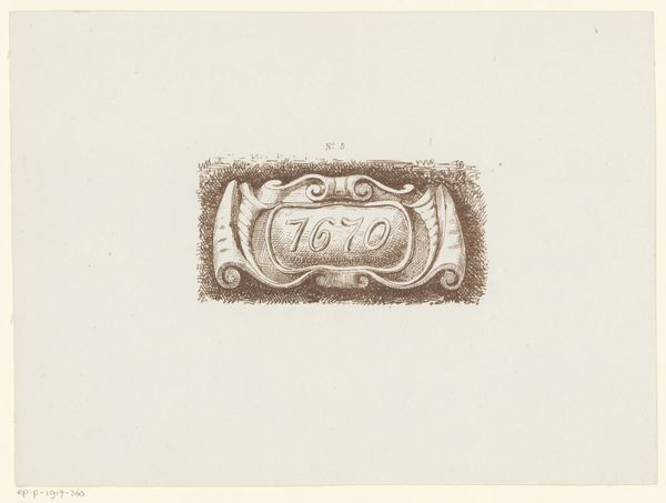 Curator: This is a print entitled "Cartouche met het jaartal 1663" created sometime between 1877 and 1894 by Jac van Looij. It's an engraving. Editor: My immediate impression is that it's small and delicate, almost like a finely wrought emblem. The contrast of the textured background against the clean lines of the cartouche itself is striking. Curator: Absolutely. The process of engraving, the precise hand needed to create those fine lines, speaks to a whole history of printmaking. And what was the social function of these prints? Were they made for wealthy collectors, or did they circulate more widely? That influences its reception. Editor: We can read it purely as a composition of lines and shapes. Note how the swirling forms of the cartouche are contained within that rectangular frame. The engraver utilizes a range of subtle marks and lines that create a rich, textured visual. The number 1663 becomes this kind of key or code to enter the artist’s work. Curator: It’s tempting to see the cartouche, that ornamental frame, as pure decoration, but let's consider its function in this time period. This emblem would certainly denote a particular cultural and intellectual history. Think about the tradition and symbolism inherent to this date. It invites a reading rooted in material and cultural conditions. Editor: Yet, the image transcends its historical specificity because of the universal appeal of the golden ratio as the work focuses on creating the most harmonic division of spaces as well as creating an intricate composition using abstract geometrical form. The beauty comes simply through contemplation on how our mind makes sense of visuals, patterns, shapes, forms. Curator: I think what interests me is how something seemingly simple as a print connects to larger societal and historical events. The social fabric in which van Looij lived would affect the subject and creation of this engraving. Editor: Ultimately, it presents an opportunity to examine the foundational aesthetic qualities of lines, composition, and proportion, and the artist uses his craft to make a geometrical and aesthetically pleasing image that still stimulates our eye and makes us contemplate on how patterns or compositions may be aesthetically interesting. Curator: Considering it as an artifact enriches our understanding beyond its mere visual qualities. Editor: And for me, looking closely, it opens into the intrinsic design qualities that underpin it. It makes you realize how deeply impactful the artist and their understanding of visuals.