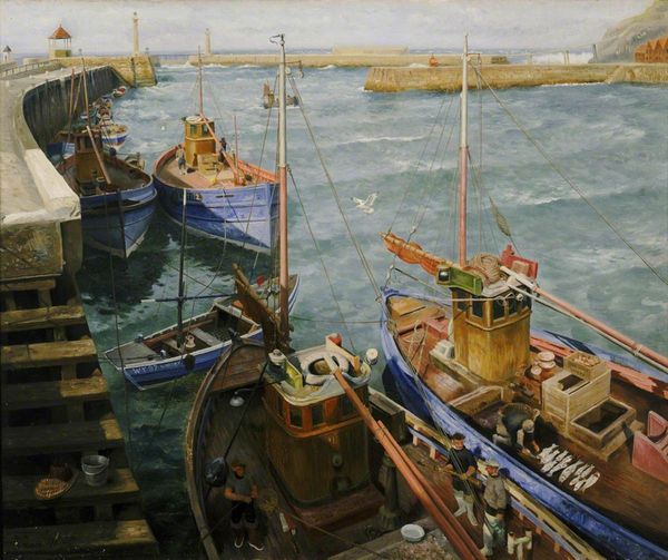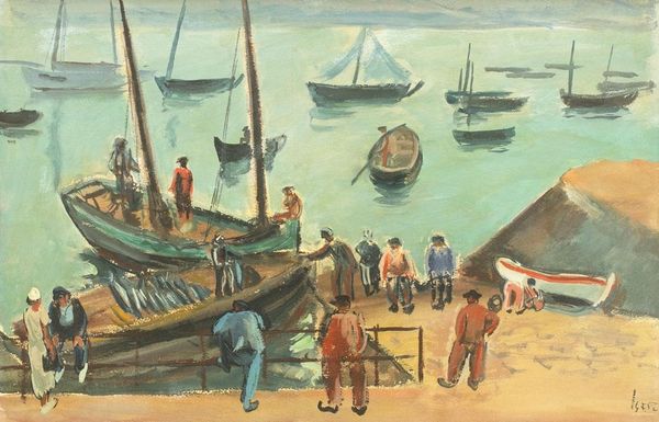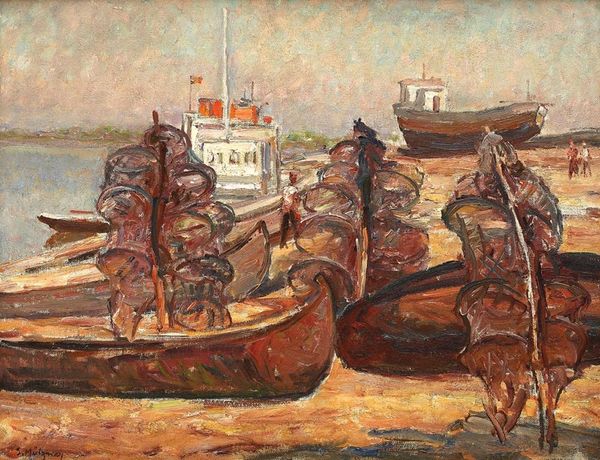 Curator: Periklis Vyzantios' painting titled "Port" gives us a bright, sun-drenched scene. It captures the essence of daily life at a harbor with boats, workers, and animals. What are your first impressions? Editor: Immediately, the brushstrokes capture my attention. They're so thick and layered— the impasto is quite pronounced, giving a very tangible sense of depth and texture. The color palette feels bright, like a summer day by the sea, though there's something almost crude or naive in how those elements sit together. Curator: Absolutely, and the use of impressionistic and abstract expressionistic style is deliberate; note how light plays on surfaces. This work offers visual poetry, drawing on shared archetypes—boats symbolize journeys, and harbors, a point of arrival or departure. This intersection would create in the collective consciousness both hopeful or apprehensive states of mind. Editor: I see that. The structural rendering of the vessels and figures really interests me too. It feels very deliberately unfussy, which somehow heightens the impact of the rich materiality and how the light refracts across the canvas. It doesn't focus on realism in any conventional sense. Curator: Indeed. Vyzantios invites us to contemplate the universal rhythms of labor and commerce, the timeless interaction between humanity and the sea. Donkeys symbolize burden bearing and resilience, hinting at the continuous toil that underpins maritime life and trade that can be understood interculturally. Editor: It is an absorbing work. The lack of precise details almost encourages a personal, internalized engagement with the imagery—the light, forms, and textures—rather than getting bogged down in narrative. This might evoke different feelings on different people, according to who we are, even cultural background could inform our appreciation of "Port". Curator: A beautiful meditation on the symbolic resonance of coastal life, its ever-shifting dynamics caught in paint. Editor: And structurally compelling piece that draws you into the tactile realities of the portrayed scene.