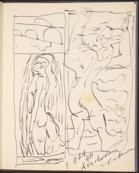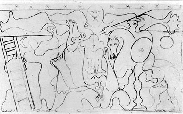 Corneliu Michailescu made this ink drawing, Composition, in 1960. Michailescu lived through a tumultuous period in Romanian history, experiencing both World Wars and the rise of Communist Romania. The drawing presents a scene of abstracted forms and figures, with a figure at the lower left that seems to be sleeping. The artist plays with the interplay between solid forms and negative space in the work, creating a sense of depth and ambiguity that reflects the mood in the Eastern Bloc at the time. The lines are bold and the composition is dynamic, hinting at the way that identities are made ambiguous in times of political turmoil. Michailescu's Composition invites us to consider the complex relationship between personal identity and political reality.