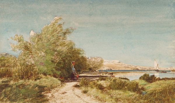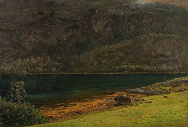 Editor: Here we have John Frederick Kensett's "Study of Rocks, Newport," an oil painting that presents a rugged coastal scene. The painting strikes me as peaceful, yet monumental, in its detailed depiction of the rocks. How do you interpret this work? Curator: It’s fascinating how Kensett captures the emotional weight of these enduring forms. Rocks, as visual symbols, are loaded. Think of their presence in myths – they're often associated with steadfastness, resilience, and the passage of time. What might these rocks represent within the cultural memory of the Hudson River School, where nature was often seen as a reflection of the divine? Editor: I suppose they could symbolize the eternal, unchanging presence of nature in contrast to the fleeting nature of human life and progress. Curator: Exactly! Consider, too, how the Romantic era imbued landscapes with deep personal meaning. Do you notice anything in the light or composition that might reinforce this symbolic reading? Editor: The soft, diffused light creates a sense of tranquility, and the rocks dominate the foreground, almost like a protective barrier. It evokes a sense of awe, reminding viewers of nature's grandeur. Curator: And those are powerful emotions tied to specific cultural moments. Remember the anxieties of industrialization creeping into the landscape. These rocks become more than geological features; they're a cultural touchstone, linking viewers to a primal, untamed past. It evokes longing for the untouched. What do you make of the limited palette, those subdued greens and greys? Editor: The restricted color palette emphasizes the solemn, timeless nature of the scene. It also makes me think about how artists select visual vocabulary and a particular set of symbols to represent ideas about nature at a specific moment. Curator: Precisely! So, perhaps this study isn't just about rocks but about invoking the past as a way to reflect on and even grapple with the anxieties of the present. Editor: I'm definitely walking away with a deeper appreciation for the layers of meaning embedded within this seemingly simple landscape. Thanks.