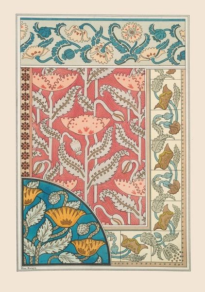 Editor: This is "Sagittaire 2" by Maurice Pillard Verneuil, a print created in 1896. It has an intriguing layout, a visual sampler of designs. I’m curious – how does this particular piece fit into the broader context of Art Nouveau and its aims? Curator: Well, Art Nouveau sought to break from academic art by embracing decorative arts, aiming to make art a part of everyday life, and that's evident here. It challenged the hierarchy that privileged painting and sculpture. This print exemplifies the movement's ambition to integrate art into functional design. Notice the different treatments of botanical forms. The intention isn't necessarily scientific accuracy, but adaptation for various surfaces. Editor: It's almost like a mood board for interior design of the time. But what role did prints like this play in making art more accessible? Curator: Exactly! These prints facilitated mass production and distribution, lowering costs and introducing modern design to wider audiences. This democratized aesthetics in a way previously unimaginable, especially when championed by venues such as department stores that embraced the aesthetic in advertisements and interior design to promote commerce. It shifted art's perceived function. Instead of high art being reserved for the wealthy elite in galleries and museums, this design becomes something democratic to be enjoyed. It brought beauty to wallpaper and textiles and all manner of products. Do you see that reflected in any specific element of this print? Editor: I suppose the repetition and the clear patterns are key to that reproducibility and the visual appeal it creates in a pattern for functional things. This print seems less about individual artistic expression and more about serving a function. Curator: Precisely. And it calls into question traditional notions of artistic authorship, making design itself the prominent voice. It serves the cultural demand for a modern aesthetic, adapted across mediums. Editor: That really reshapes my understanding of the purpose of art. I was so caught up in the high art context, but this shows its social function. Curator: It certainly does, a reflection on how art history continuously influences social trends, then and now.