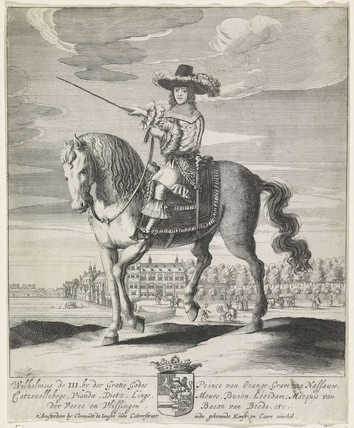 Editor: Here we have a print titled "Equestrian Portrait of William III, Prince of Orange," created sometime between 1660 and 1684. The piece strikes me as formal, almost staged. What can you tell me about it? Curator: What I see here is a carefully constructed assertion of power. William III, though still quite young when this image was circulated, is intentionally portrayed in a manner befitting a powerful ruler. Think about the symbolism of the horse itself – for centuries, it has been a symbol of dominance, of the aristocracy, of military might. Editor: Right, but what about the fact that it's a print? Doesn't that make it more accessible? Curator: Precisely. Consider the political climate. William was a figure around whom ideas of Dutch identity and resistance to absolutist rule coalesced. Making this image a print meant it could be widely distributed, bolstering his image as a strong, divinely appointed leader but also as a figure accessible to the Dutch populace. Editor: So, the medium itself becomes part of the message. Is the landscape in the background also significant? Curator: Absolutely. The controlled, manicured landscape is not just a backdrop; it reflects the idea of ordered power and control extending beyond the individual, impacting the entire nation. It presents William as the shepherd of his people, entrusted with overseeing a prosperous, well-managed territory. Now, what do *you* make of the gaze that he directs toward the viewer? Editor: That’s interesting… it is very direct and almost confrontational, isn’t it? I hadn’t thought of how actively that reinforces his dominance. Curator: Exactly. And think about how the act of depicting William this way influences ideas about leadership. We are seeing how image and power reinforce one another through printmaking, making it accessible to all classes and therefore highly impactful on political dynamics of the time. Editor: This has given me so much to think about in terms of how art intersects with power and accessibility!