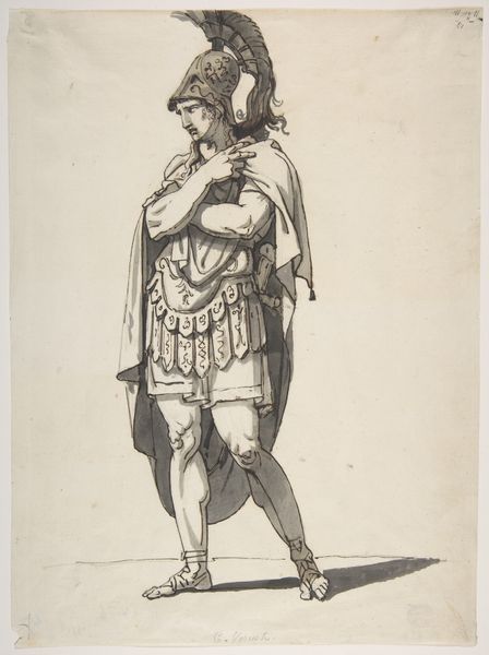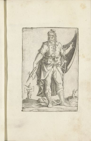 Curator: Let’s examine “Standing Warrior with Axe,” an engraving from 1728 by Johann Elias Ridinger, here at the Rijksmuseum. My first impression is its rather static composition feels like a staged representation rather than something capturing the vitality of military prowess. What do you see? Editor: It definitely lacks dynamism! I see a curious portrayal of power through a distinctly European lens. Look at this figure, ostensibly a warrior. How does Ridinger depict the warrior's identity, especially considering prevailing social hierarchies of the time? Is this Romanticizing, an idealizing, or something more complex? Curator: Focusing on materials, it is remarkable how much detail is achieved through the relatively simple medium of engraving. The linear quality and the textures suggested through cross-hatching create an almost photographic effect despite the limitations. Notice the subtle tonal gradations around his torso! Editor: True, but let's unpack this "warrior." His clothing appears vaguely "exotic" yet still falls squarely into the tradition of European depictions of non-European men as both powerful and othered, even submissive. Think about how concepts of race and colonialism shape our reading of his posture, his weaponry, and his presentation. Curator: I see him more as a character in a staged drama than a concrete social representation, or even some claim to social truth. I'm interested in how Ridinger made practical use of copper and acid in an alchemical way. We should analyze printmaking traditions! Editor: Fair point! Still, we can't ignore how that approach flattens real identities and socio-political structures in its construction of generalized “types” rooted in European-centrism. What happens to history, lived experiences, and the complex relations of power when someone is merely rendered a "type"? Curator: You suggest a compelling analysis. Focusing purely on technique may obscure something beyond production, something deeper! Editor: Exactly! By addressing power and representation in relation to aesthetics and print, we start to reveal a very dynamic view of 18th century ideologies. Curator: That gives me much to contemplate. Editor: Indeed, the engraving is richer the more it can be interpreted.