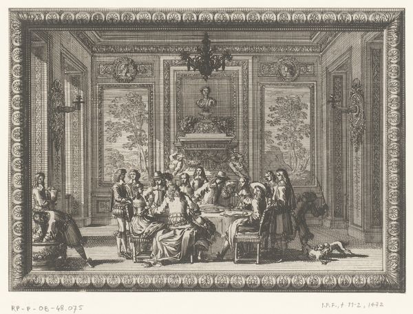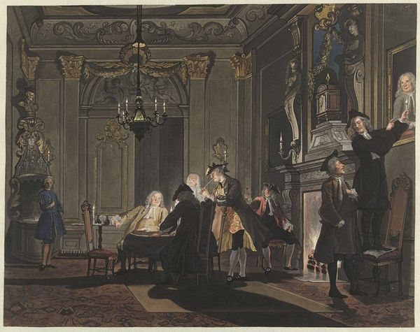 Curator: This painting, titled "The Art Gallery of Josephus Augustinus Brentano," was created by Adriaan de Lelie around the 1790s and is currently held at the Rijksmuseum. My immediate sense is one of studied nonchalance—a carefully arranged display of wealth and taste. Editor: Yes, that’s exactly it. The composition itself mirrors that idea: all of the elements seem deliberately positioned to create a scene brimming with significance. A series of framed paintings are in the background, hung salon-style—while in the foreground we see people seemingly observing other paintings. There's a real mirroring going on. Curator: Indeed. It’s as if de Lelie wanted to capture not just a collection of art but a whole culture around art appreciation. The symbols are fascinating; you’ve got the architectural flourishes, the rich textiles, the knowing glances exchanged between patrons...it all signifies a specific type of cultivated worldliness. Think of the continuity in this practice through the ages. Editor: And note how the artist’s composition emphasizes the act of looking, turning it into a visual motif in its own right. People observe other artworks. Art contemplates itself. The light, filtered through what appears to be a window to the right, gently illuminates each participant’s face, heightening the drama of their interaction with art. Curator: Precisely. And the warm, green color palette is so redolent of its time, that transition period between the Enlightenment and Romanticism, which carried distinct social markers and emotional tonalities. What do you think about this palette? Editor: Absolutely, there’s a prevailing harmony—but notice also that the symmetry is carefully disrupted. Certain figures stand out, whether through their clothing, or positioning. The eye jumps around constantly! It gives life and dynamism to what could otherwise be a very staged setting. Curator: A beautiful demonstration of how much can be encoded into what appears at first to be a simple scene of observation. Editor: A rich visual tapestry that resonates on many levels. I find that idea captivating.