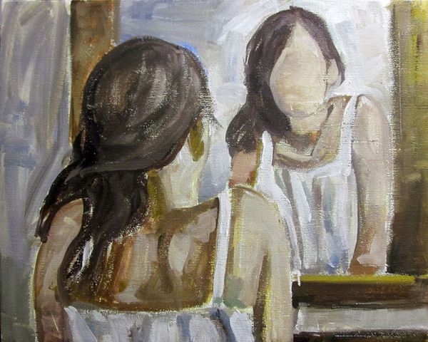 Zani Corrado painted this canvas, Senza Titolo, in an unknown year with oil. The palette is muted and the marks are laid down quickly, wet into wet, with a focus on shape and tone rather than detail. It has that lovely all-over feeling. Up close, you can see how Corrado uses the brushstrokes to build form. Notice the way he models the figure’s arm with soft gradations of tone and colour. And how about the absence of a face in the mirror? It makes the painting so ambiguous, almost existential. Are we looking at a reflection of someone, or some idea? The more I look, the more this painting reminds me of Gerhard Richter’s portraits – the same blurring of image and form, the same kind of restless questioning. The title, Senza Titolo, it's the perfect complement to this feeling. It all adds to that sense that art is a conversation, always open to new voices and new ideas.