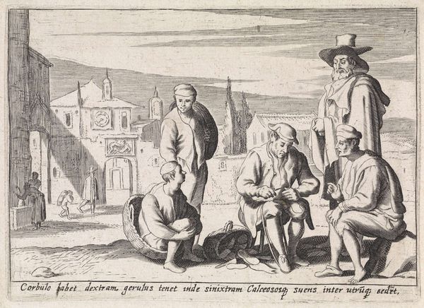 Curator: So here we have “Verkoper van aardewerk,” or "Pottery Vendor" which was produced anonymously sometime between 1613 and 1667, a bustling little scene rendered in engraving. What strikes you immediately? Editor: The labor, of course! The vendor stooped under the massive burden of pottery he carries – I’m immediately drawn to that back-breaking weight, to the sheer materiality of it all. He *is* the shop. Curator: Yes! It makes you think about what it cost them. To lug these goods, which seem fragile as whispers, into town. And you have the man with a stick and hat as counterpoint: maybe the local big-shot or a broker of some sort. Notice how aloof he seems. Almost theatrical in that broad hat. Editor: There’s such a hierarchy embedded in something as simple as buying pots! These weren't just objects of use. Consider the Dutch Golden Age, the rise of mercantilism, these pots become part of that visual rhetoric of prosperity and access. Were these even for the common person? Curator: It does beg the question, doesn't it? I wonder about the lives, mundane but maybe exquisite in some small way, that would orbit around these vessels. Picture the hands that shaped them, the conversations held over a humble earthenware cup... Isn't it something how a simple print can contain multitudes? It becomes less about the thing itself and more about its echoes. Editor: But, without the materiality, without the dirt under their fingernails, we wouldn't have the echoes to contemplate! This little print becomes a powerful document, illustrating not just a scene, but the invisible tendrils of labor, consumption, and social class woven into everyday objects. Curator: You’re right. It grounds the ethereal imaginings to something palpable. Now, I find myself itching to touch some clay. Perhaps it is that humble touch that links us through time.