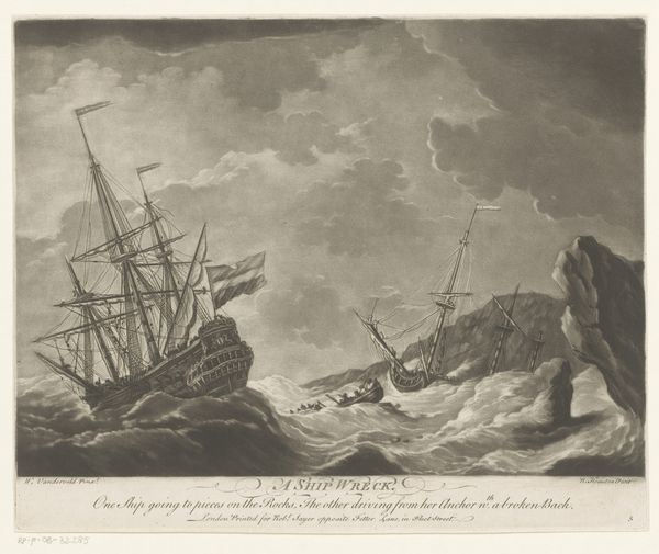 Curator: Here we have “Kampen mellem 6 danske kanonbåde og det engelske linieskib "Dictator"” created by Niels Truslew in 1808, an aquatint and coloured pencil print, currently residing at the SMK. What strikes you immediately? Editor: The vastness! It's unsettling; the enormous sky and sea dwarf the vessels. The human drama seems so fragile and precarious against nature's indifference. Curator: Yes, Truslew certainly understood Romanticism’s key visual tropes. Note how he’s structured the composition; the low horizon line emphasizes the scale of the English warship "Dictator." The Danish gunboats appear comparatively diminutive, almost overwhelmed by this behemoth and the sublime, empty ocean. The light and colour, that faded sky. Editor: I’m struck by what it suggests about asymmetric power. It’s difficult to overlook the context. This image memorializes an underdog story. Denmark, caught in the Napoleonic Wars, valiantly resisted British naval dominance. What appears as Romantic awe can also read as defiance in the face of impossible odds. Curator: It is also quite interesting as a study in contrast: observe the detail of the rendering of the 'Dictator' alongside the more abstracted, gestural brushstrokes of the smoke and water. There is dynamism at play, almost an intersection of careful maritime record keeping with something looser, perhaps symbolic of the chaotic and destructive power of the war at sea? Editor: And note those traces of colour; the delicate blues and pinks in the sky, heightening the almost dreamlike state of the scene. The aestheticization of conflict; an important act when picturing and trying to justify conflict, indeed, memorialising this particular event. Curator: Indeed, we find ourselves confronting tensions here, a dynamic interplay between aesthetic beauty, compositional elegance, and an engagement with the difficult realities of war, or the politics underpinning national narratives of the time. The work offers considerable room for thought. Editor: A piece that pushes us to reflect on how history and art intertwine, showing us conflict's raw face and art’s reflective capacity. Thank you for elucidating it.