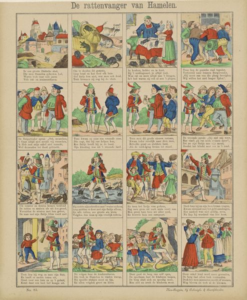 Editor: This artwork is titled "De betooverde prinses", or "The Enchanted Princess," created sometime between 1876 and 1900. It’s a watercolor print and seems to tell a story through sequential images, almost like a comic strip. There’s something both charming and slightly unsettling about the visual narrative. What's your take on it? Curator: Unsettling is a good word. The playful Art Nouveau style certainly charms, but underneath, don’t you feel a whiff of the uncanny, perhaps like stepping into a dream slightly gone awry? It reminds me of leafing through a childhood book only to realize the characters have a sly wink in their eyes now that I’m older. Editor: Definitely! What strikes me is the depiction of animals behaving like humans—what does that mean to you? Curator: Well, anthropomorphism, assigning human traits to animals, has always been a way for us to explore aspects of ourselves from a safe distance. It’s the oldest form of character building, the ability to judge other people and also examine our place within hierarchies, customs and laws. Are those creatures mirrors reflecting our follies back at us? What's it reflecting? The absurdity and theatricality of courtly life maybe? I feel invited to consider not just what the artist wants us to see, but *why*. Editor: So it's a sort of whimsical social commentary. I was focused on the surface narrative, but I now realize the artist wants us to question the whole theatre of status. Thanks for helping me look deeper. Curator: My pleasure! Art should feel like a delicious invitation to an ever-evolving feast, don’t you think? There are always new ways to experience and feel the art with you.