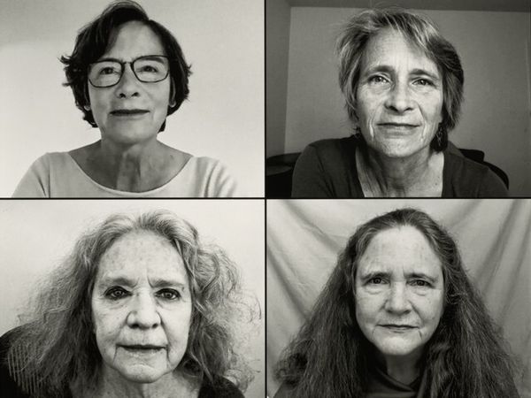 Editor: We’re looking at "The Brown Sisters, Truro, Massachusetts" by Nicholas Nixon, from 2017, a gelatin-silver print. There's an incredible starkness to this portrait; it’s very intimate and raw, even slightly haunting. What strikes you when you look at this work? Curator: What strikes me is the intentionality Nixon brings to bear by repeating this portrait every year. We are looking at the evolving, cumulative effect of representation. It transcends the individual sitting—focusing instead on how the annual ritual of being photographed together affects them and our interpretation. The photograph becomes a social artifact as much as a portrait. How do you think the historical context shapes how we view this work today? Editor: Well, considering how obsessed our culture is with documenting ourselves through images, this seems to resist that urge in a way. Instead of carefully curated, joyous images of ourselves that we put forward, this photo presents these women without any artifice, right? It's almost confrontational. Curator: Precisely! It makes you think about what Nixon *isn’t* showing, right? The project really challenges conventional portraiture in the media, where controlled images of women dominate. Think of it as a subversion of these power dynamics within art itself. The continued project amplifies those notions even further. Why do you think Nixon returned to the same subjects, year after year? Editor: Maybe to show the honesty in aging and change, in direct opposition to media’s obsession with youth and novelty. Curator: I agree! That is an important aspect, because each picture captures not just individual aging, but their shared history as it accumulates annually. The piece functions as a type of evidence. We are prompted to consider that within institutions like the museum, works become cultural touchstones as they continually are seen over time. Editor: It is fascinating to see the effects of time in their faces, and the role this consistent capture plays. Curator: Absolutely. It urges a different type of portraiture, one more honest in approach. Editor: I’ll definitely think about image-making in a more social and historical way going forward. Thanks for sharing your thoughts.