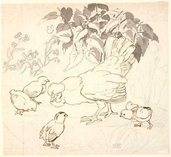 Gillis Claesz. de Hondecoeter made this ink drawing of chickens and roosters in a yard. The drawing's composition is a study in controlled chaos. Hondecoeter uses line to define the forms of the fowl, massing them together in a seemingly haphazard arrangement. Yet, there is a clear structure at play. The artist presents the birds in various poses, creating a dynamic rhythm across the sheet that guides our eyes, inviting us to engage with each element in a structured manner. Hondecoeter’s choice of ink as a medium reinforces a sense of immediacy and spontaneity. The quick, gestural lines suggest the fleeting movements of the birds, capturing the essence of their vitality. This lends the drawing its charm. Ultimately, the drawing is a testament to the artist’s keen observation and his ability to distill the essence of a scene into a series of elegantly rendered lines, revealing an underlying order and structure.