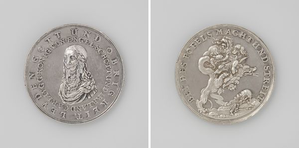 Editor: Here we have "Tweede eeuwfeest op het overleveren van de Augsburgse geloofsbelijdenis op de Rijksdag" created in 1730 by Peter Paul Werner. It looks like a silver coin or medal, with finely detailed relief work on both sides. The workmanship is beautiful, but it strikes me as quite formal. What do you see in it? Curator: Well, let's think about the materials first. Silver wasn’t just a precious metal; it signified wealth, power, and status in 18th century Europe. Who was commissioning this medal? And who would own or distribute them? Editor: I see, so the value isn’t just aesthetic, but deeply tied to economic realities. Does the use of silver change our understanding of its message? Curator: Absolutely. This wasn't mass-produced propaganda. This was a carefully crafted object, probably intended for a select group: wealthy patrons, maybe clergy, people deeply invested in the legacy being commemorated. Editor: And what was the process to produce something like this? Curator: Consider the labor involved: the mining and refining of the silver, the skill of the die cutter, the striking of the medals themselves. Each stage reflects a specific form of labor and expertise, further reinforcing the hierarchical structure of society. Does that influence your view of its message? Editor: Definitely! The medal now appears not just as a celebratory marker, but as a product of considerable resources and skilled labor, meant for an elite audience. The very making of it speaks volumes. Thank you! Curator: Indeed! Considering the conditions under which objects are produced reveals much more than just surface meaning. It really grounds our understanding of its place in the world, and how it functions within social systems.
