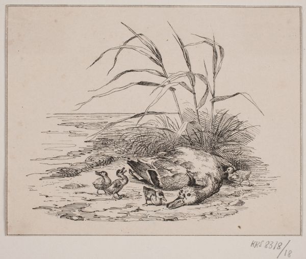 Johan Thomas Lundbye created this pen drawing, "The Killed Wild Duck," as an illustration. Notice how the composition is structured around the stark contrast between life and death. Lundbye uses delicate lines to depict the lifeless body of the duck, sprawled out in the foreground. The texture created by the hatching technique emphasizes the duck’s stillness. Around the duck, the scene comes alive: slender reeds sway in the background and the water is delicately rendered. The artist uses precise, yet softer lines to capture the vulnerability of the ducklings that surround their dead mother. The choice of subject is interesting for children’s fables. Does Lundbye subtly question the sentimental values often associated with illustrations for children? The formal structure directs us to contemplate how meaning arises not just from the subject but also from the visual language employed. This challenges viewers to look beyond the surface and engage with the broader complexities of existence.