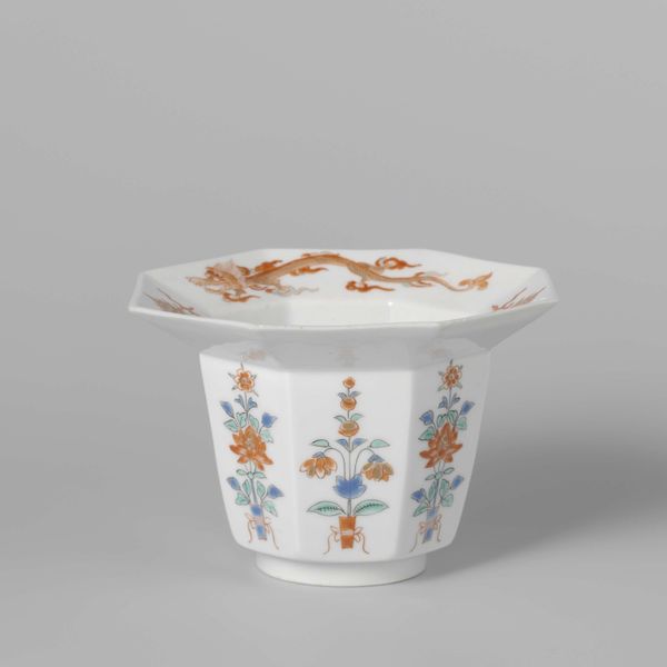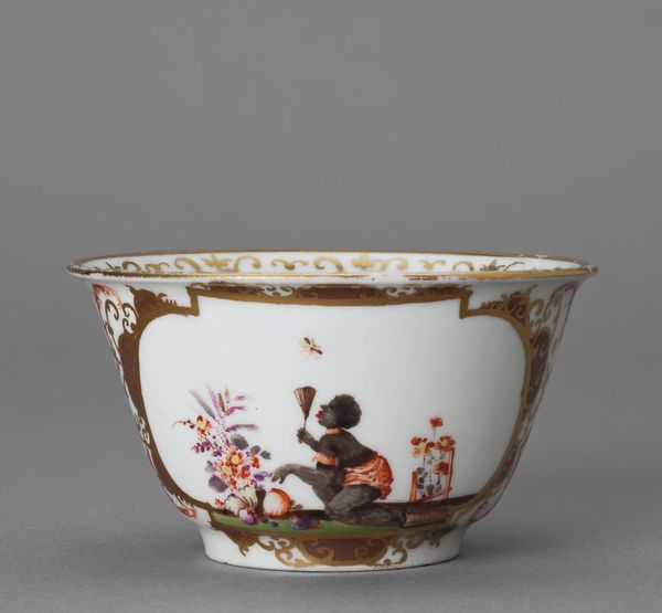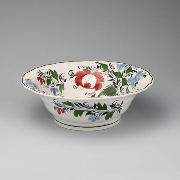 Curator: This is a tea bowl crafted by Karl L. H. Müller, dating back to sometime between 1873 and 1876. It resides here at the Metropolitan Museum. Editor: It feels like a contained breath of fresh air, doesn't it? The simple shape, adorned with that modest floral design—a whisper of spring in ceramic form. There is a lovely decorative aspect, a little precious even, that makes you just want to reach out and turn it slowly in your hands. Curator: Absolutely. Müller was deeply immersed in Asian art traditions. Crafted from earthenware with its painted design, it beautifully displays those leanings with distinct imagery. You notice the prominent botanical imagery; what comes to mind when you focus on these motifs? Editor: It is striking how contained everything is, pressed into service as a delicate emblem, hinting at, well, everything, like most flowers can! They carry a distinct and layered symbolism for the patient observer. Even this isolated floral arrangement has many things to communicate to us in its composition: what season it is, what mood we are in, even perhaps the owner's preferences. Curator: Precisely. While Müller embraced Eastern aesthetics, this tea bowl also showcases the period's taste for the exotic and refined decorative arts. There’s a lovely tension there. A conversation. Editor: In other words, we can easily find ourselves asking whose culture it is, and what exactly does 'decoration' do to these more potent and evocative images? Can we really separate their symbolism, from our symbolic act of possessing this artwork? This tea bowl and how it might exist within culture is like a cup with limitless tea... I am really happy to be thinking with it today! Curator: It invites reflection. I find myself grateful to it for calling me here. Thanks so much for chatting about it with me today.