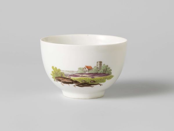 Editor: So, this is a porcelain teacup, part of a larger tea and coffee service made by Loosdrecht before 1778. It’s decorated with little figures in a river landscape, all in this beautiful beet-red color. It’s delicate but the landscape imagery also gives it some depth. What's striking about this object to you? Curator: I’m immediately drawn to the materiality of it. We’re looking at porcelain, a highly prized commodity in the 18th century. Loosdrecht, a Dutch manufactory, was trying to replicate the coveted hard-paste porcelain from Asia and places like Meissen. Consider the labor involved: from sourcing the raw materials to the skill required for painting these tiny scenes. This wasn't just about drinking tea; it was about displaying wealth and participating in a global network of trade and consumption. Editor: That's fascinating. I hadn't really considered the global aspect of it. I was mostly focused on the painted scene itself, a little genre painting in miniature. So, how does the choice of the landscape scene relate to the social context? Curator: Well, landscape imagery provided a safe subject for the rising bourgeoisie, in that period, who sought to signal their access to leisure. Owning such porcelain was a deliberate choice. Think about it - did they portray explicit wealth in the paintings, or create landscapes that would be inviting and serene for a teatime chat? Editor: The landscape certainly speaks to an appreciation for nature and perhaps a desire for tranquility. Curator: Precisely. And beet-red is a fascinating color choice too, as that could also affect its reception and even pricing in its day, speaking again to the value attributed to specific material features. Thinking about the processes and the hands that made it allows us to view a teacup, as more than just a delicate item, it embodies stories about trade, taste, class, and artistic ambition. Editor: That definitely gives me a richer appreciation for the cup. I see it now as a small window into a whole world of 18th-century society. Curator: Exactly! Now, consider this lens while you study any new works from that time period.