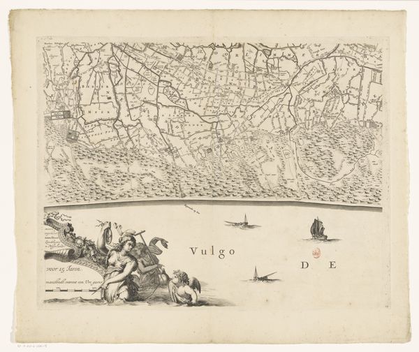 Editor: This is a portion of "Kaart van het dijkgraafschap Drechterland," a map from 1775 by an anonymous artist. It’s an engraving on paper depicting the Dutch region of Drechterland. What strikes me is the contrast; the precise lines of the map above versus the more whimsical scene at the bottom. What do you make of this piece? Curator: Ah, a map that is so much more than a map, wouldn't you agree? It reminds me of a theatrical set. On one hand, you have the rational, almost clinical rendering of land and sea—the rigid grid, the neat parcels of land. Then, look how our cartographer lets his hair down, creating these almost mythological beings frolicking at the bottom. It makes me wonder: was the cartographer longing to escape the demands of accuracy, perhaps dreaming of faraway lands? Do you see a tension between those two aspects? Editor: I do, yes! It's like they couldn't quite decide what they wanted this piece to *be*. The map feels so functional, but the figures... why include them? Curator: Why not! Perhaps it's a wink, a playful invitation to see the land not just as something to be measured and controlled, but as a source of stories, of wonder. Consider the context, a world increasingly defined by reason, by the scientific gaze, where perhaps artists found refuge in a realm unbound from accuracy. A map may not be simply about location but what those locations represent. What thoughts and emotions can be conveyed from this "landscape"? Editor: That makes a lot of sense! I hadn't thought about it that way, as a commentary. I’d been stuck on whether it was "accurate" enough as a map, rather than seeing it as a snapshot of the time period that blended objectivity with whimsy. Curator: Precisely. It's about the push and pull of different ways of seeing, or wanting to see, the world. This, I believe, offers a window into a fascinating mind. Now, doesn’t that thought leave a warmer taste in your mouth than you expected? Editor: Absolutely, thank you! I'll never look at a map the same way again!
