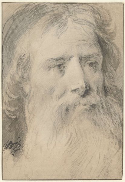 Editor: Here we have Alphonse Legros’s print, “W.H. Longfellow, 1st plate.” It’s quite delicate, almost ethereal, with these fine lines creating the portrait. What strikes you about this particular print? Curator: The composition is dominated by the figure, rendered in delicate strokes against what seems to be intentionally unarticulated space. Notice how the density of lines around the face draws the eye, creating a focal point amidst the surrounding sparseness. What structural relationships do you observe between the figure and its ground? Editor: Well, the face and beard have a lot more detail compared to the clothing, making it pop, though the whole image feels unfinished and simple, almost like a study. Curator: Precisely. The unfinished quality foregrounds the artist’s process. The interplay between positive and negative space becomes significant here. Consider the visual weight given to areas devoid of lines, and how this contrasts with the detailed facial features, structuring our gaze. Where do you perceive a divergence in technique that influences your interpretation? Editor: I see that. The varying pressure of the pencil creates depth despite the monochrome palette. It almost gives the figure a sense of quiet dignity, even in its sketched state. Curator: The success of the piece lies in its technical economy. By deploying a minimalist approach, the artist allows for an increased semiotic reading from the barest of visual cues. A heavier hand would stifle the expression and the visual relationship in their expression, do you agree? Editor: I think you're right, it is about this economy of form. Focusing on how Legros uses line and space gives a richer reading. Curator: Indeed. Attending to these compositional techniques refines our appreciation beyond a purely representational understanding. Editor: This close examination changes how I will look at portraiture in the future!