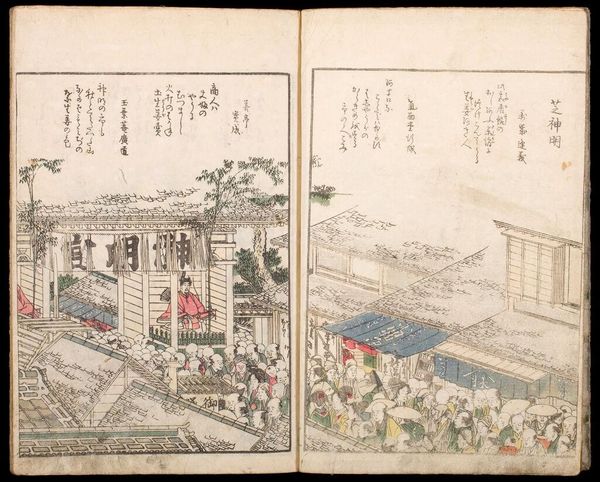 Curator: This Hiroshige book, "Illustrated Satirical Poems About Famous Scenic Views in Edo," feels so light and airy, even with the weight of all that text! Editor: Indeed! It’s fascinating how Hiroshige blends landscape with social commentary. These woodblock prints, bound together as volumes 5 and 6, depict scenes of Edo—now Tokyo—through a lens of humor and critique. Curator: The figures seem so busy, caught up in their daily routines. The satire adds another layer; I imagine viewers chuckled at these scenes while recognizing themselves in them. Editor: Absolutely. Consider the figures carrying goods across the bridges. It speaks to the socio-economic dynamics, labor, and even the inequalities of Edo society. Curator: It all feels so delicate. The thin lines capture the essence of the moment. A fleeting observation, rendered with such care. Editor: It also connects us to a specific time, a period of urban growth and social change in Japan, made accessible through art. Curator: A poignant reminder of the everyday, elevated through Hiroshige's artistic vision. Editor: Art as a mirror reflecting society's joys, struggles, and everything in between.