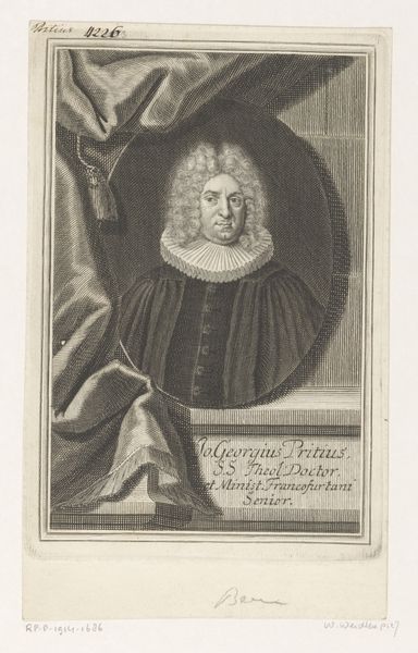 Editor: We're looking at a piece called "Portret van Christian Ludwig Ermisch" made sometime between 1719 and 1732 by Johann Georg Beck. It's an engraving on metal, currently held at the Rijksmuseum. What strikes me first is the sheer level of detail achieved with lines, creating so much texture. What elements stand out to you, in terms of its formal qualities? Curator: Initially, one notes the elaborate play of contrasting textures. Observe the subject’s voluminous ruff, sharply juxtaposed against the stark smoothness of his face. This creates a visual tension, focusing the gaze. Consider, too, how Beck uses linear perspective within the confines of the oval frame to construct spatial depth. Does this linear intricacy enhance the symbolic value of the portrait, do you think? Editor: I hadn't thought about that consciously. The linear density definitely gives a sense of seriousness. Almost like, the tighter the lines, the tighter the mind. Is the portrait's baroque style simply a function of its time, or are there specific baroque elements that are meaningful? Curator: Indeed. Consider how the composition directs our eye— from the soft drapery at the upper left down towards the inscribed plinth on the right, a classic Baroque strategy of guiding the viewer's eye throughout the pictorial field. Furthermore, reflect on the balance between ornate detail and the overall structure; baroque art often employed ornamentation to convey both spiritual and psychological intensity, how do you see it functioning here? Editor: So it's not just decoration; it is almost a diagram of where to focus, with visual elements and patterns working to emphasize those features. Thanks, I now perceive those strategic contrasts that drive the composition. Curator: Precisely. It is about controlled orchestration using shape, line and tone, isn't it?